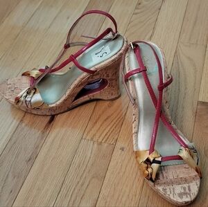 Beautiful 8 1/2 never worn wedge. Cork wedge with Red patten leather detail inside of the heal and straps.