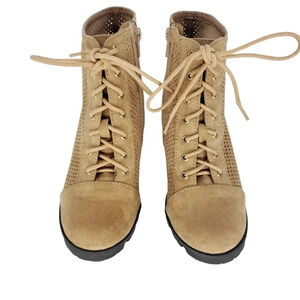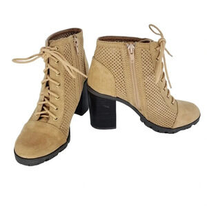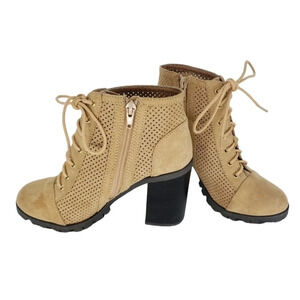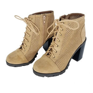 Qupid Ankle Booties Perforated Lace Up Block Heel Boots