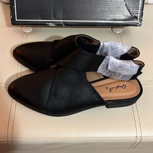 Very cute ankle wrap mule by Qupid. Please note that in the photos, the ankle buckle is wrapped. These are new in box. Size 6.5 only.
