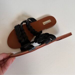 Qupid Size 6 Sandals Black leather upper braided straps Flat sole man made Great condition.