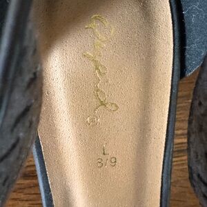 Chic black sandals with intricate cutout design. Features a stylish tan heel. Perfect for versatile wear.