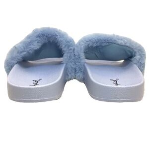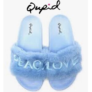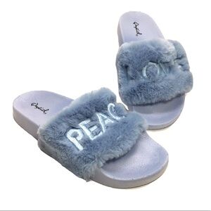 Qupid Blue Faux Fur Peace Love Open Toe Slides