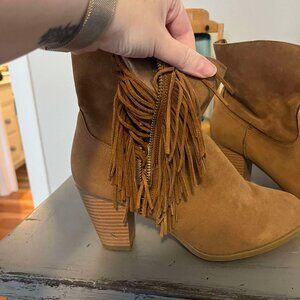 Adorable tan suede booties. Has size zip and fringes. Small mark on heel as shown in photos. Otherwise, excellent condition!