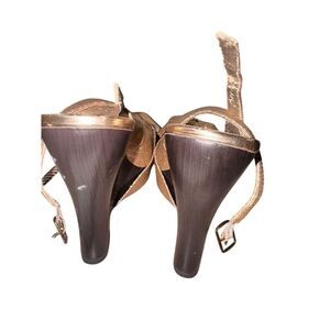 These slingback wedges scream holiday party!! Not only stylish but comfortable featuring a high wedge heel and a peep toe design. The gold synthetic upper material is adorned with a glitter pattern and a bow accent, making it ideal for party or cocktail occasions, especially in the spring season. The shoe is a slip-on style, offering convenience and elegance. It is pre-owned.