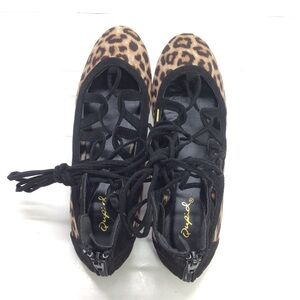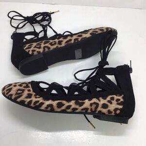 Qupid Faux Suede Animal Print Lace Up Ballet Flats