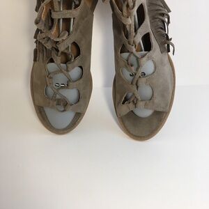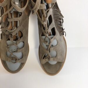 Qupid Gray Gladiator Stacked Block Heels Shoes Size 9 With Long Strings Tie
