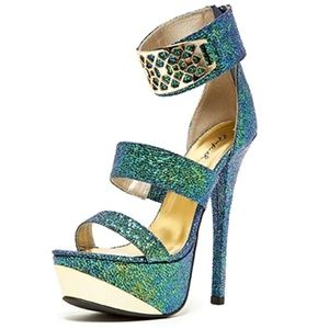 Qupid Iridescent Metallic Embellished Open Toe Platform Heels Count-55x Teal is in perfect condition.