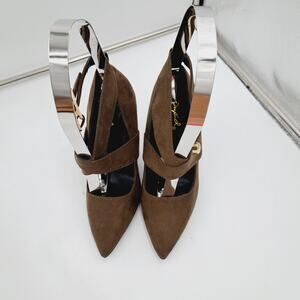 Qupid Khaki Green Cross Strap Goldtone Buckle Stilletto Heel Pointy Toe 5.5