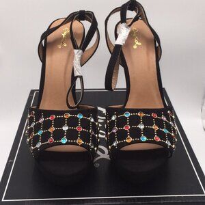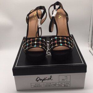 Qupid Ladies Platform 5” Heels Pumps Black Suede Size 10. Style: Avalon-231X. Open toe. Multi color rhinestones. Faux suede. New with box.