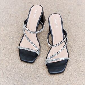These exquisite heels are crafted to make a statement and leave a lasting impression wherever you go. These heels feature a strappy black satin upper, adorned with sparkling rhinestones that catch the light with every step you take. The intricate rhinestone embellishments create a dazzling effect, adding a touch of opulence to your ensemble. The black color exudes sophistication, making these heels versatile and perfect for various occasions. Whether you're attending a formal event, a cocktail party, or a night out on the town, these heels will elevate your style and make you the center of attention.