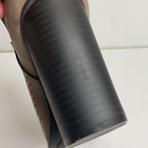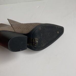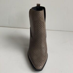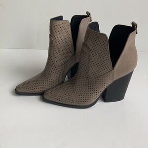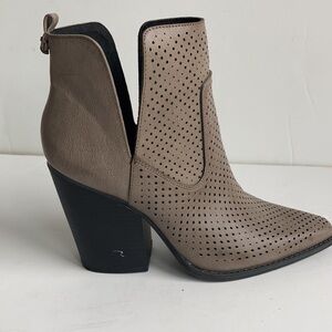 Qupid V cut mesh dark taupe bootie. Faux leather. Closed pointy toe. Side cuts. 4” heel. Small flaw on heel as shown in pic.