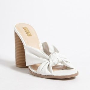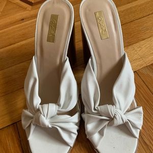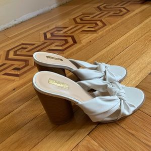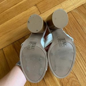 A pair of faux leather heels by Qupid™ featuring a slip-on construction, a metallic twist-front strap design, open toe, and a chunky wooden heel.Content + Care- Padded insole, textured outsole- All manmade materials- Made in ChinaSize + Fit- Heel height: 5"- Platform: 1.3"