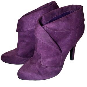 These sassy purple microsuede booties have an asymmetrical cuff and a 4” heel. In excellent used condition. No box.