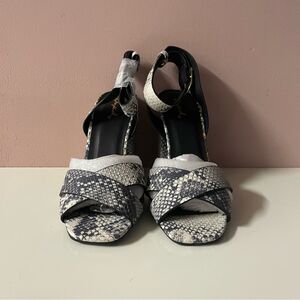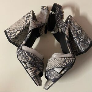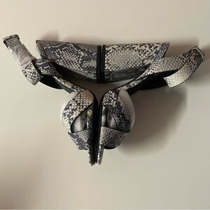 Pretty snakeskin faux leather heels with a cross-cross peep toe, open front, a buckled ankle strap, and a chunky block heel. Perfect for parties with a classic little black dress. Also great for casual outfits with jeans or a matching two piece pant/skirt set. New in box! Forgot to take the heel measurement, but if you’d like to know it, let me know! Feel free to ask questions or make an offer!
