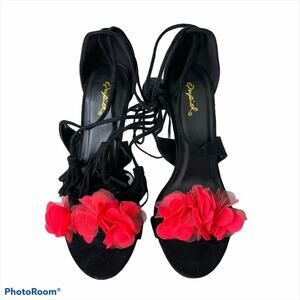 Qupid NWOB Fringe Wrap Tie Sandal Red Flowers Open Toe Stiletto Heel Size 5.5