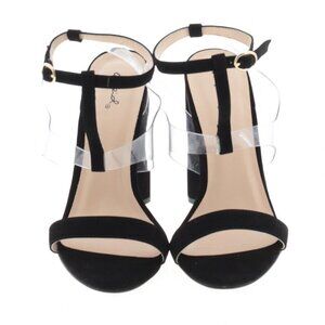 These heels features a nubuck material, single band at open toe, and clear strap at mid-vamp to an adjustable ankle t-strap. Finish with lightly padded insole and chunky heel.