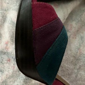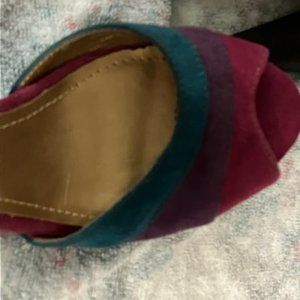 Never worn Purple and teal peep toe high heeels by Qupid . They say size 6 1/2 but they run tight . They have been packed with summer clothes and forgotten till now .