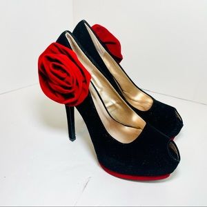 Black Velvet with a Gorgeous Red Rose on the outside of both shoes.