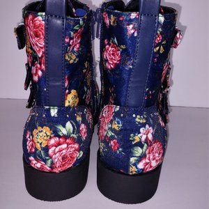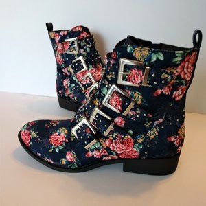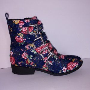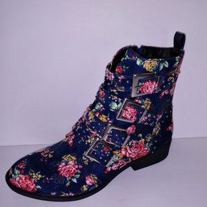 Qupid Rose Print Blue Denim Ankle Boots Buckles 5.5 - 10