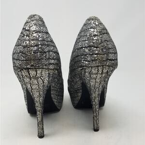 These silver metallic platform stilettos are in good pre-owned condition, featuring a 1-inch platform and a 5-inch heel. A stylish choice for adding some shine to any outfit.