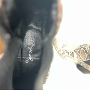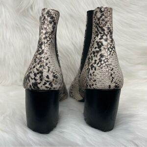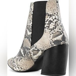 Features: snake print, block heel, ankle style, pointed toe, faux leather