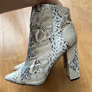 Qupid Snakeskin Heeled Pointed Toe Ankle Booties, Size 10