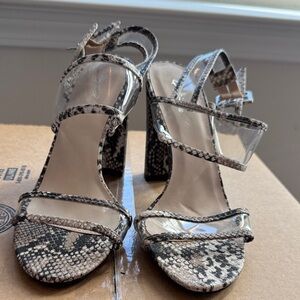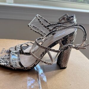 Stylish snakeskin heels with clear straps. Perfect for a modern look.