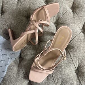 Qupid Strappy Sandals. Heels feature a square toe and an adjustable buckle ankle strap. Heels measure approximately 4”. Vegan friendly, man made materials. Non skid sole. Runs small suggest ordering half size bigger than normal. NEW WITH BOX