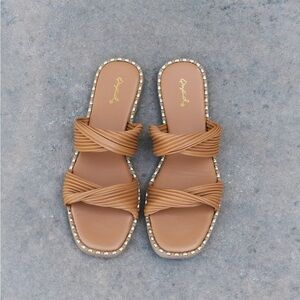 Qupid Summertime Fine Double Strap Twist Sandals Camel