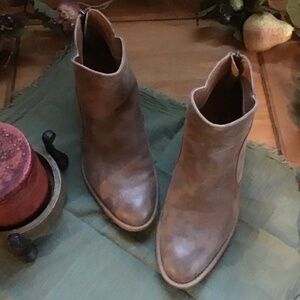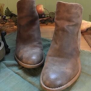 These taupe suede booties by Qupid are so attractive with the asymmetrical boot opening, a 2 3/4” stacked heel, and traditional R shaped toe. With the zippers in back, they are easy on and off, ready to go when you are! They are in excellent pre-owned condition. The shaft measures 7” in the front and 6 1/2” in the back, creating a very attractive style. They are so versatile, they may very well be your favorite “go to” bootie.