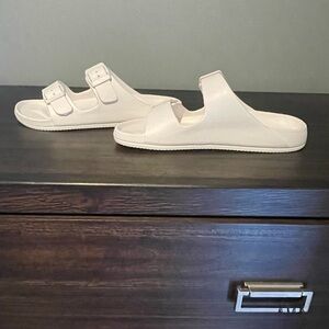 Chic white sandals with double buckle design. Ideal for everyday wear. Never worn and TTS.