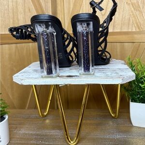 Step out in style with these elegant black strappy heels. Featuring a unique glitter block heel, these shoes add a touch of glamour to any outfit. Perfect for a night out or a special occasion.
