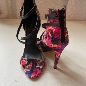 Qupid satin multi color floral open toe ankle straps sandals with back zipper Sz10.pre owned in good used condition no tear normal wear see all pictures any questions please message.