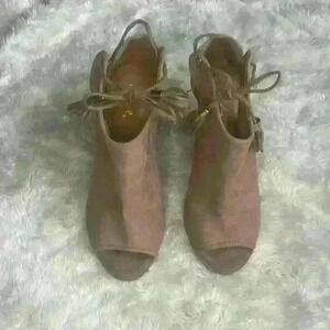 Qupid tan faux suede, peep toe, block heel woman’s size 7.5