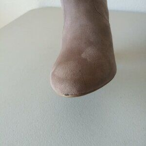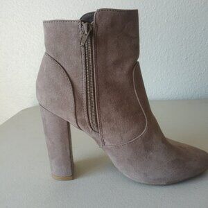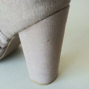 Qupid taupe faux suede block heel, gold detail at the heel, lace up stitch accent, side zipper closure