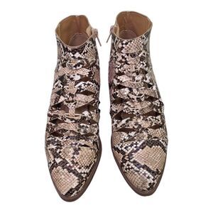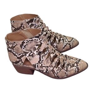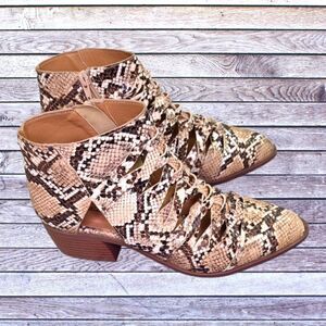 Gorgeous snake print booties with pointed toe. Has cut outs throughout the top and side. Zipper entry.