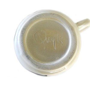 Quyle Kilns small mug, coffee cup with hand painted dogwood blossom design. Signed. Circa 1980s. Perfect condition. No cracks, no chips, no crazing. Beige, white, dove gray, and yellow colors. 10 oz capacity. 4.5" X 3" X 3.5"H.
