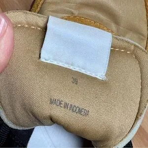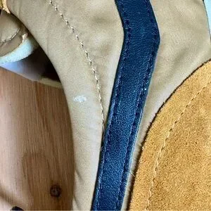 A small scuff on heel, and a couple of small white spots on trim. See photos.