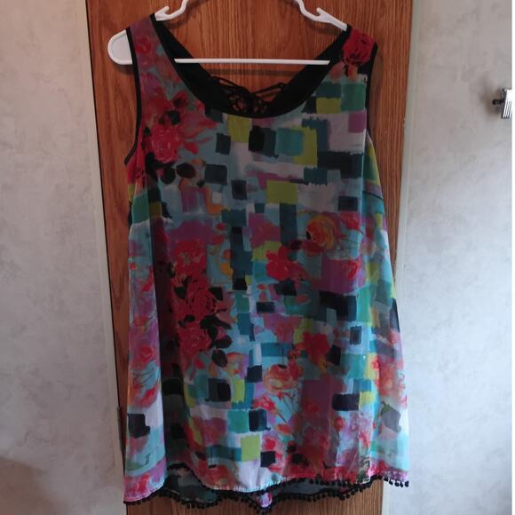 Lightweight, artsy statement tank with a corset-style lace-up neckline that gives major early-2000s boutique energy. The abstract multicolor print pops without feeling loud, making this an easy grab for festival season, concerts, vacations, or styled under a jacket for everyday wear. Feminine cut with visual interest at the neckline — this is the kind of top buyers search for when they want something different but wearable.