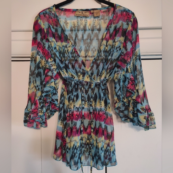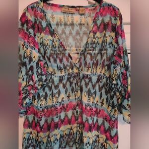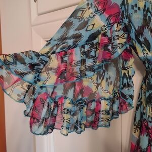 Colorful top with a mix of blue, pink, and yellow patterns. Features a unique design.