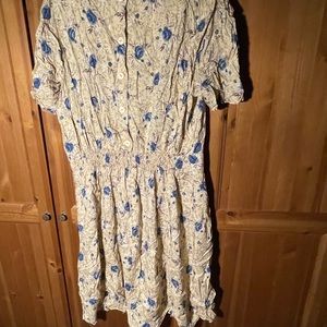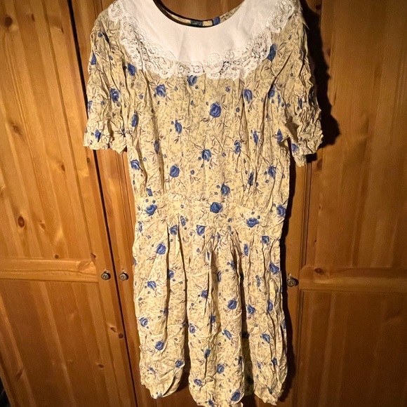 Multicolor yellow w/blue roses, white lace collar, button down back and zipper 100% Rayon PTP 28.5 - L 43