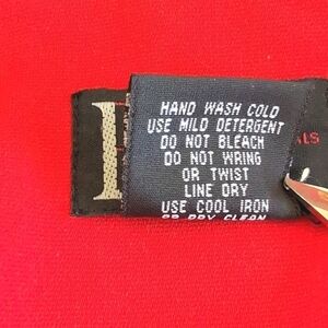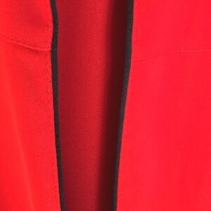 Red with Black Trim Open front Jacket Size 10. 100% Polyester. Has 2 front pockets. Also small shoulder pads that can be easily removed if you want. Excellent pre-owned condition with no flaws.