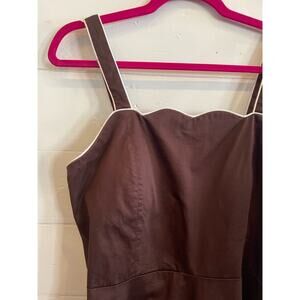 Vintage a-line cut style dress, brown with white piping, stretchy zip up back, scalloped edge chest, pockets.