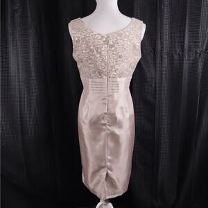 R & M RICHARDS PETITES! CHAMPAGNE BEIGE SATIN, LACE & RHINESTONE DRESS! SZ 10P