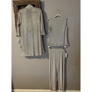 This lovely 3 piece set is from R & M Richards in a women's petite size 10 pant and petite 12 top/jacket. Style No 7162P. "Champagne" Silver in color. Top is lace with metalic shimmer. All made of polyester/spandex and hand washable. Pull on style top and pants. Pants have elastic and relaxed wide leg fit. Pant inseam 30.5 inches.