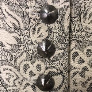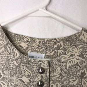 R & M Richards by Karen Kwong Button front Blouse Size 10 Cream with black floral pattern. Beautiful Silver Buttons. Split front hem. Formal Spring/Summer