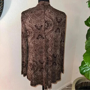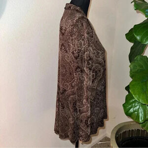 R & M Richards Brown Black Paisley Print Copper SPARKLING, Long Sleeve, high/low hem, stand up collar, shoulder pads, Evening Jacket Coat in EXCELLENT condition! Size: Medium. Freshly dry cleaned and ready to wear! (Size tag missing.) ***Styled on a size 4 mannequin****Necklace sold separately***