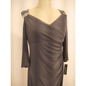 Keywords: R & M Richards gown 16, coal cold shoulder dress, plus size formal gown, rhinestone evening dress, wedding guest gown, mother of the bride dress, gala long sleeve dress, blue embellished gown