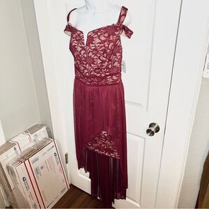 R & M Richards Morgan and Co Off Shoulder Lace Chiffon Dress Merlot Nude 18W NWT