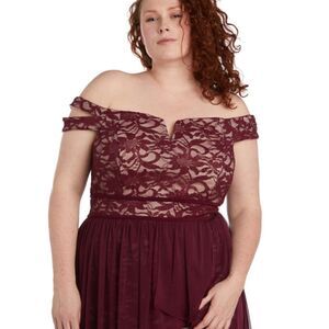 R&M Richards Morgan and Co Off-The-Shoulder Lace & Chiffon Dress Merlot Wine Nude 18W NWT. Off-the-shoulder. Unlined. Chiffon & glitter lace construction. Evening gown. Zipper closure. Polyester, spandex. Hand wash. New With Tags. Morgan & Co is owned by R & M Richards.